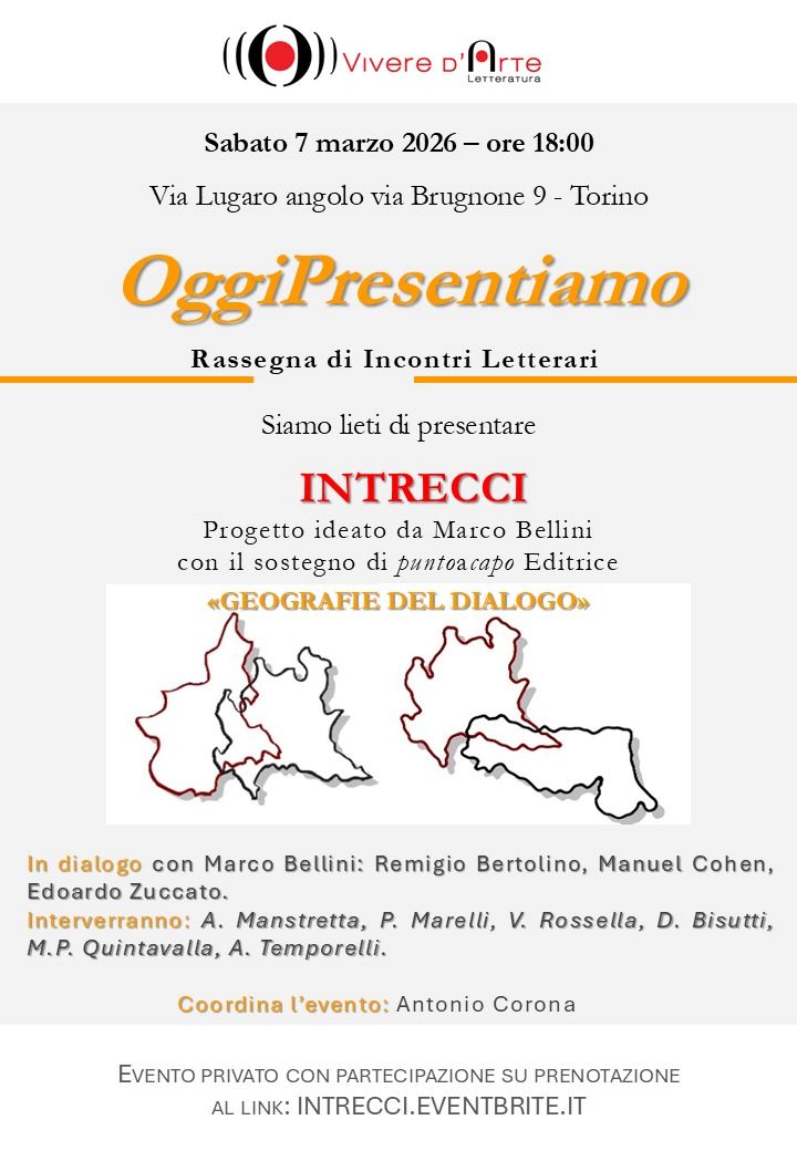“Geografie del dialogo”, partendo dal progetto “Intrecci” di Marco Bellini e Paola Loreto per Puntoacapo Editrice, è un tavolo di confronto attivo atto a preservare la ricchezza della nostra diversità linguistica, ispirandosi ai principi dell’UNESCO sulla salvaguardia del patrimonio immateriale. L’evento, parte della rassegna #OggiPresentiamo (a cura di A. Corona, A. Rienzi, R. Frattaruolo), avrà luogo a Torino, il 7 marzo 2026 presso la sede dell’Associazione Culturale Vivere d’Arte.In dialogo con Marco Bellini: Remigio Bertolino, Manuel Cohen, Edoardo Zuccato. Interverranno: A. Manstretta, P. Marelli, V. Rossella. D. Bisutti, M.P. Quintavalla, A. Temporelli.
